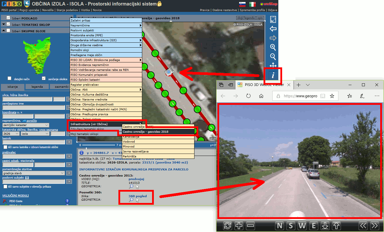Sferični - 360 stopinjski posnetki PISO omogoča pregled sferičnih 360 stopinjskih posnetkov, ki se običajno izdelajo ob videosnemanju kategoriziranih cest. Za pregled je potreben zgolj brskalnik. Objavil Blog Author 23. avgust 2018 08:46 Kategorije: Novosti PISO Ceste Prejšnja objava << >> Naslednja objava