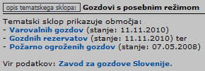 Ažuriranje podatkov: Gozdovi s posebnim režimom V tematskem sklopu Druge državne vsebine ⇒ Gozdovi s posebnim režimom smo ažurirali podatke. Stanje podatkov si lahko ogledate v opisu tematskega sklopa. Vir podatkov: Zavod za gozdove Slovenije 29. december 2010 15:42 Prejšnja objava << >> Naslednja objava