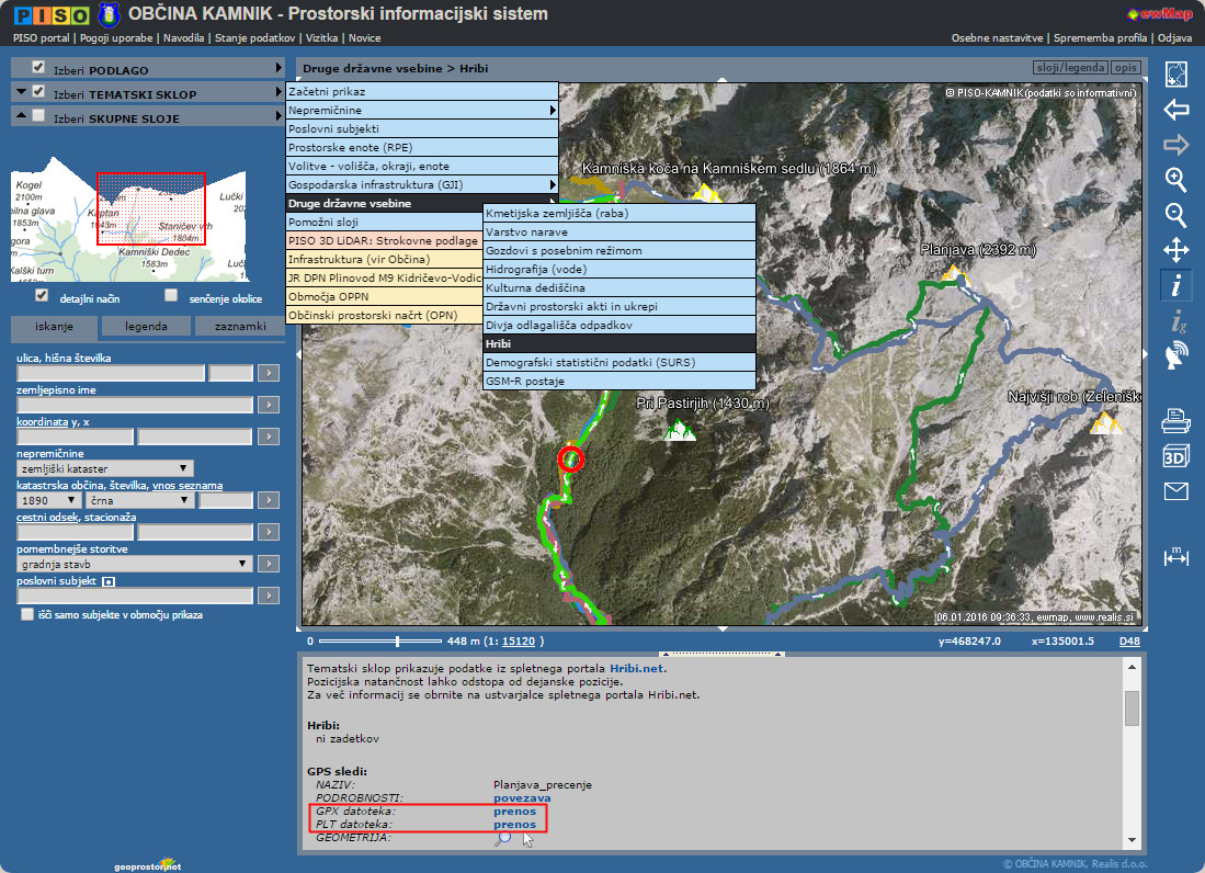 V tematski sklop Druge državne vsebine > Hribi smo vključili več kot 500 GPS poti. Podatki so pridobljeni s portala hribi.net.