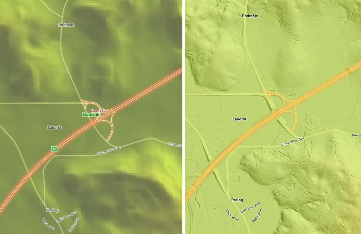 Za primerjavo med senčenjem, ki smo ga dobili s podatki DMR (levo) in LiDAR (desno) si poglejte spodnji sliki.