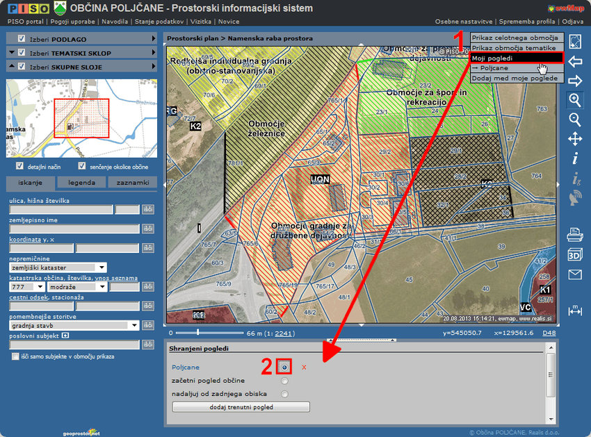 PISO spletni pregledovalnik nam omogoča, da shranimo vsebine, ki jih najpogosteje uporabljamo pri delu (kombinacijo podlage, tematskega sklopa in skupnih slojev), v svoj pogled. Shranjen pogled lahko nato kadarkoli vklopimo, izbrišemo, dodamo nove poglede, ali pa ga nastavimo kot začetni pogled ob prijavi v PISO pregledovalnik. S shranitvijo vsebin si bomo prihranili veliko časa, saj nam pogleda ne bo potrebno vsakič na novo sestavljati.