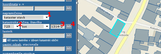 3. v vnosno polje poleg seznama KO-jev vpišemo številko stavbe in opcijsko za pomišljajem del stavbe (primer: 1314-3);