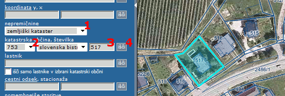 3. v vnosno polje poleg seznama KO-jev vpišemo številko parcele; lahko vpišemo tudi številko zemljiško-knjižnega vložka (ZKV), na primer "ZKV 123"