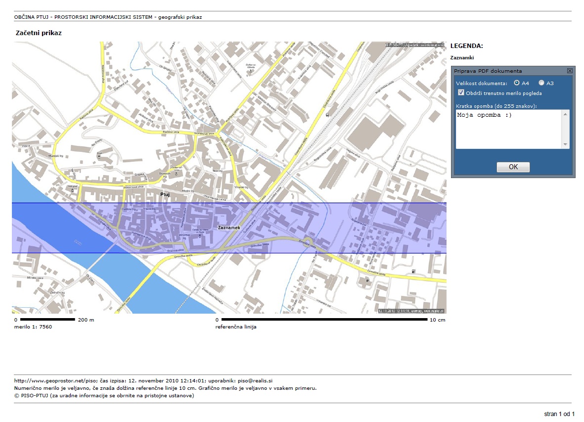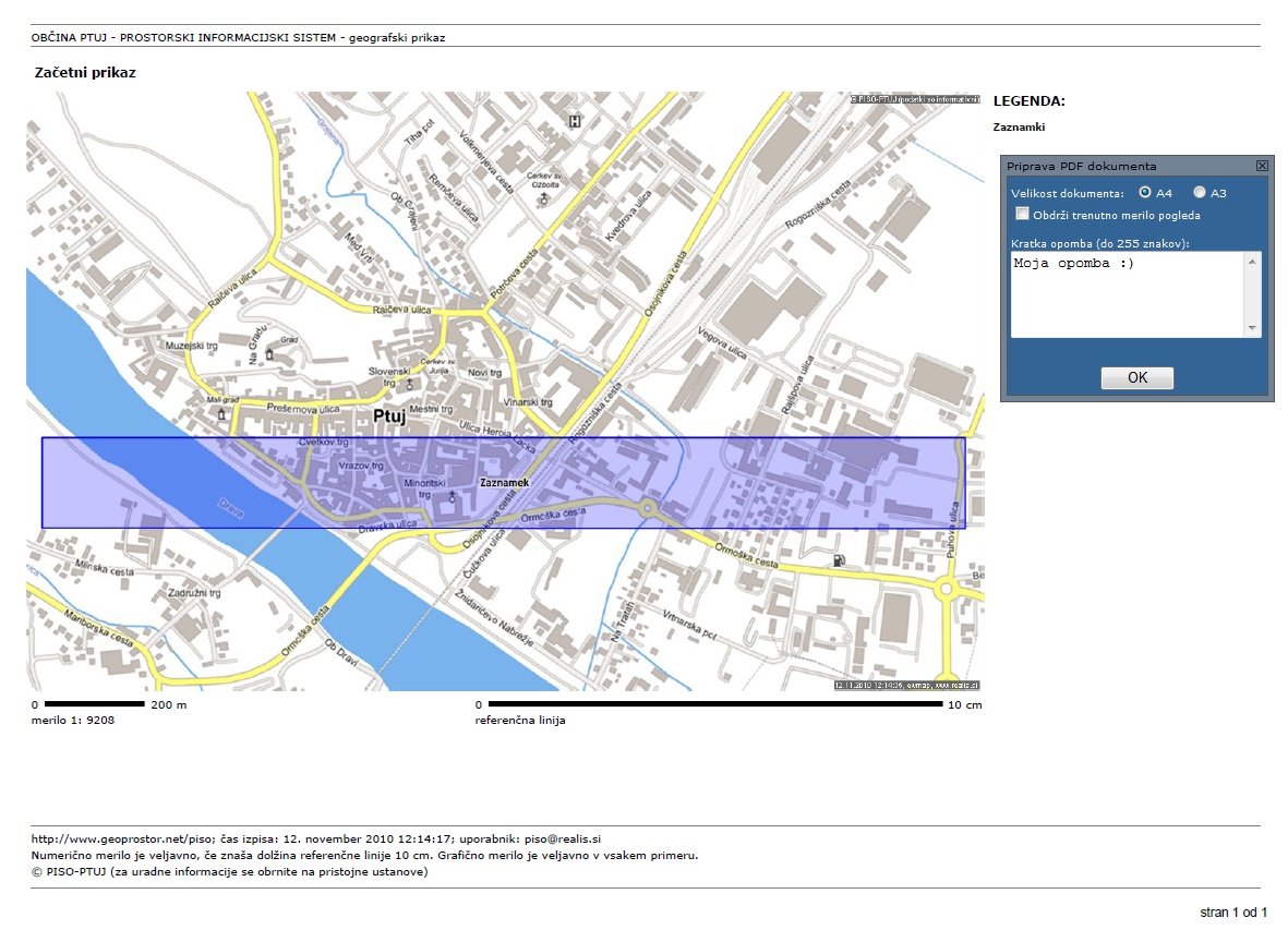 Priprava dokumenta v formatu PDF omogoča izvoz vsebine prikaza vključno z ostalimi elementi karte (naziv, okvir, legenda, merilo ...) Nova možnost "Obdrži trenutno merilo pogleda" ohranja merilo ter vsebino prikaza prilagodi formatu tiskanja (A4 oz A3). Odznačena (izklopljena) možnost pa uporabniku omogoča, da pripravi karto z najmanj celotno vsebino prikaza.