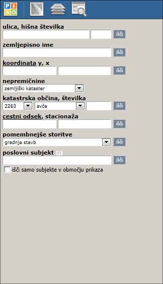 - iskanje lokacije (naslov, poslovni subjekti, parcele, stavbe, cestni odsek in stacionaža, prebivalci …);