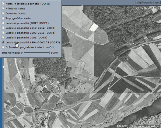 Privzeto je ob vstopu v sistem PISO izbrana podlaga Karte in letalski posnetki (DOF5), to lahko poljubno spreminjate z izbiro podlage, ki se ne spreminja na vseh merilih pogleda.