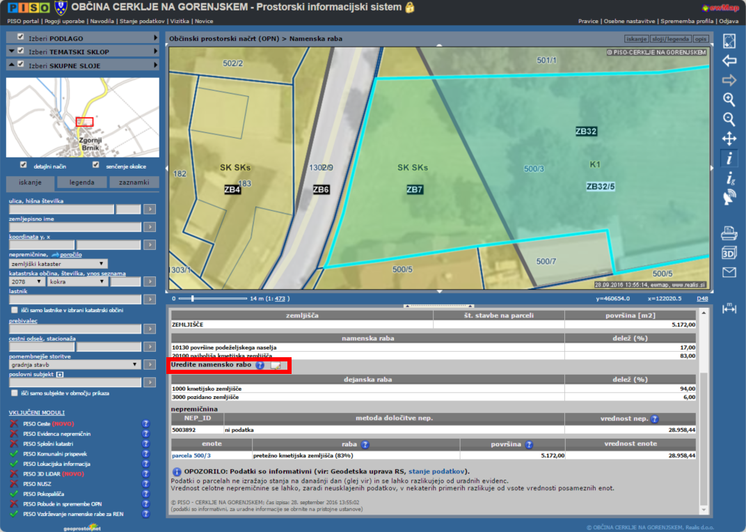 Če izberemo tematski sklop "PISO Vzdrževanje namenske rabe za REN", lahko tudi vidimo urejeno geometrijo zemljišča za gradnjo stavb (slika 9).
