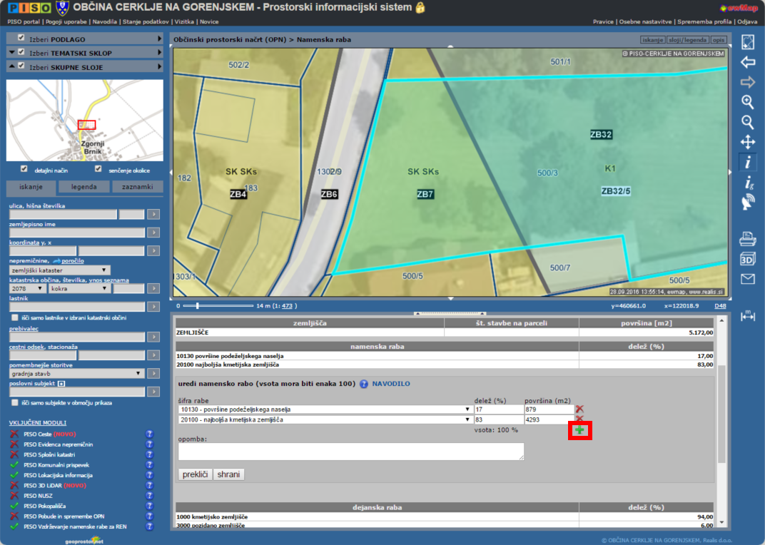 - Odpre se nam forma za urejanje namenske rabe, kjer lahko spreminjamo šifro, delež (%) ali površino (m2) posamezne rabe, odstranjujemo (