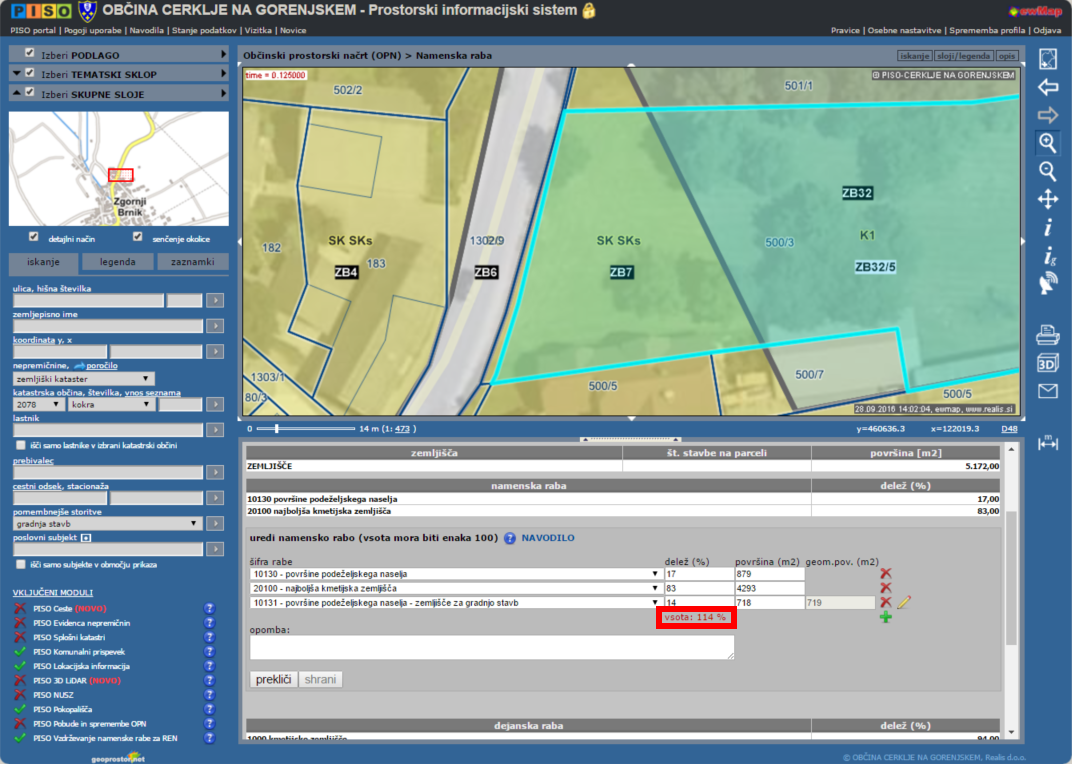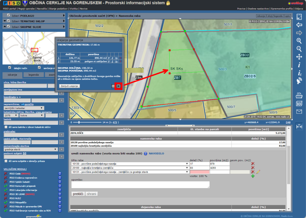 - Po končanem urejanju geometrije moramo urediti tudi deleže namenske rabe. Ko so deleži urejeni in želimo potrditi spremembo, izberemo možnost "shrani". V primeru, da sprememb ne želimo shraniti, izberemo "prekliči".