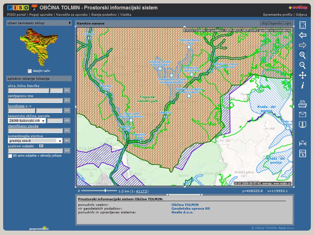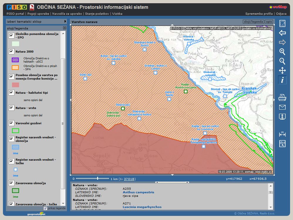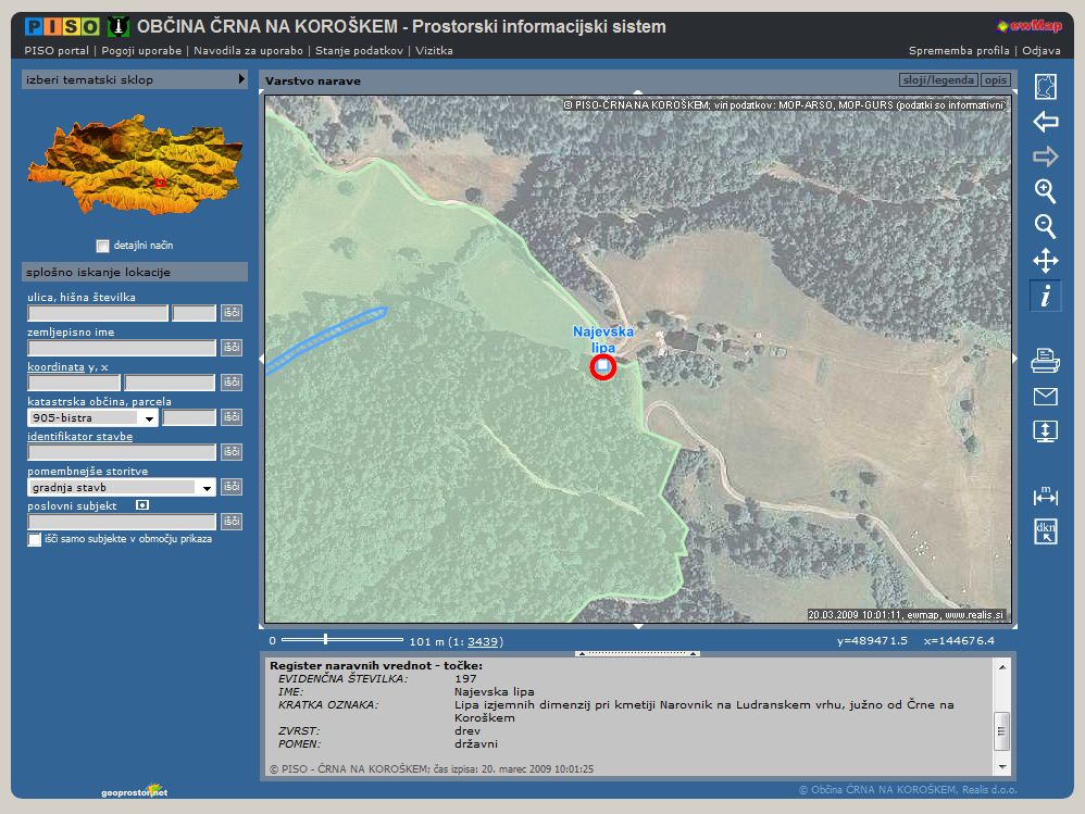 - prikaz lokacije z imenom ali območja objekta varstva narave