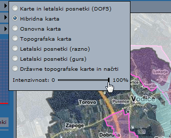 NOVOST: Dodaten nabor podlag ter nastavljanje intenzivnosti podlag Nova tehnologija prikaza podlag v sistemu PISO omogoča uporabniku, da uporablja določeno podlago pri vseh merilih. Tako je denimo omogočen prikaz letalskih posnetkov pri vseh merilih, tudi za območje cele občine. Izkušnje na področju razvoja geoinformacijskih sistemov so našim razvijalcem omogočile pripravo kartografskih podlag, ki služijo namenu brez motečih elementov. Poleg tega lahko sedaj s pomočjo drsnika poljubno nastavite intenzivnost podlag. Tako boste lahko v nekaterih primerih dodatno izpostavili sloje iz tematskega sklopa, ki bodo zaradi večje prosojnosti podlag bolje vidni. Nekaj primerov prikaza novih podlag si lahko ogledate na spodnjih slikah. Karte in letalski posnetki NOVO: Osnovna karta NOVO: Topografska karta NOVO: Hibridna karta 26. oktober 2010 08:26 Prejšnja objava << >> Naslednja objava